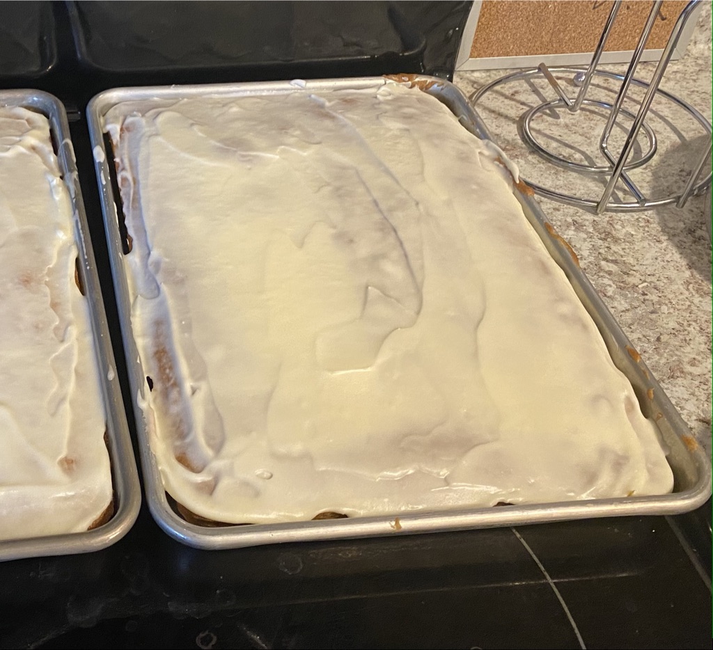 - Begin adding evaporated milk and powdered sugar until you get a consistency and quantity that you want for your cake. I used about 1/3 c. milk and 2-3 c. powdered sugar. The icing should be easily spreadable but not runny. You can add more milk and powdered sugar to make the icing stretch further so it’s up to you. If it looks too dry, add a little milk. Too runny, add more powdered sugar.