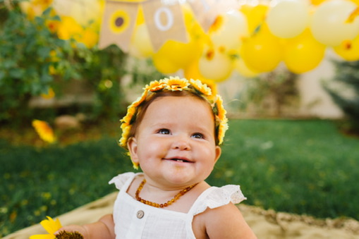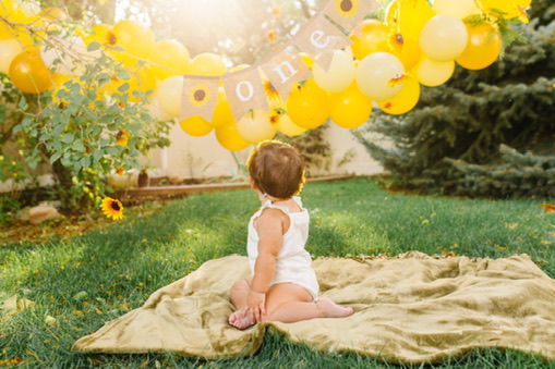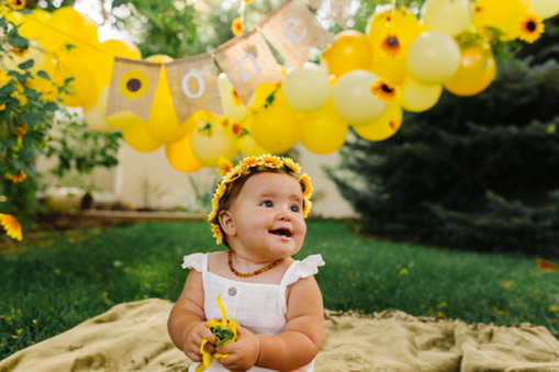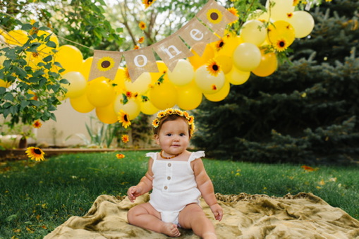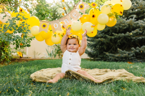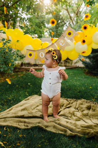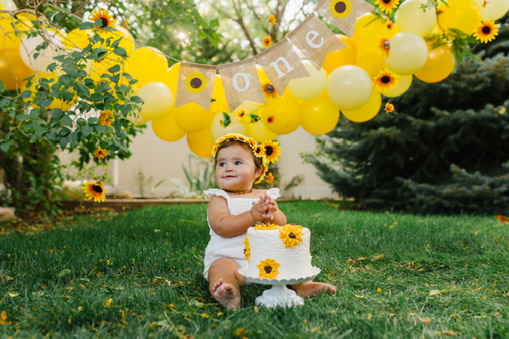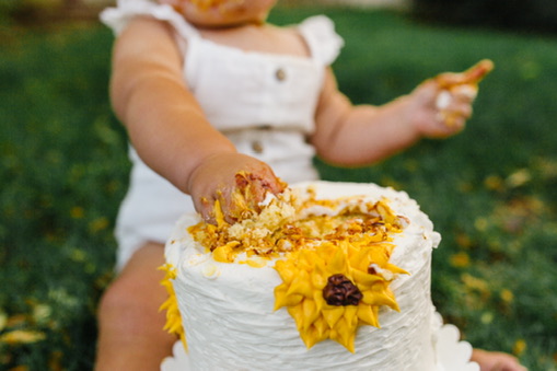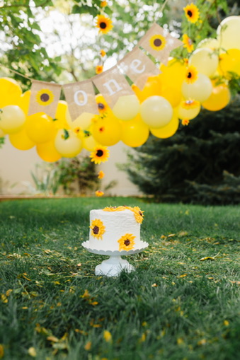 The only decorations I ended up buying were for her cake smash. Those are the pictures that mattered most to me, so I purchased a few simple things to make a little backdrop and it turned out beautiful. She wore a sunflower headband and a cute white romper and I placed her in the corner of my mom’s backyard with the decorations I bought from Amazon. I made a 6″ cake and went the easy route, using a box mix (Remember: SIMPLE). It was a yellow cake with cream cheese frosting. I piped on some sunflowers, but only on the side of the cake that would be facing the camera. [Side note: I actually ended up forgetting to bring the cake to the party and my lovely husband had to drive back to our house, 20 minutes away, to fetch the cake and bring it back to the party.]