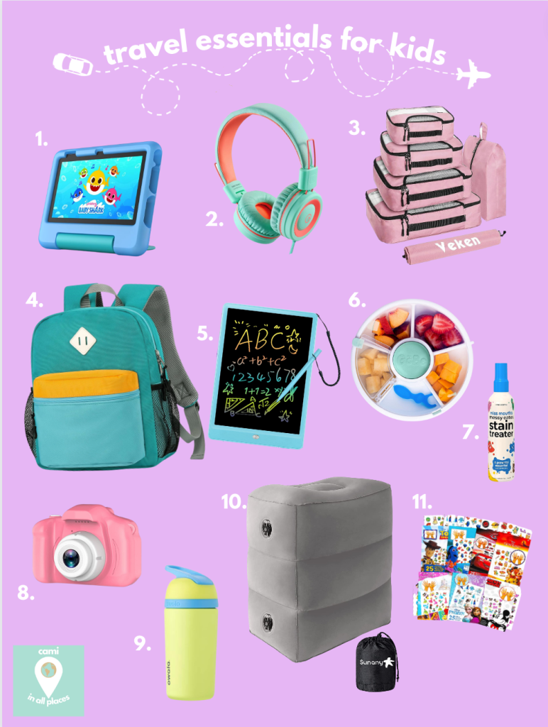 - Inflatable Footrest Pillow : We use these on overnight or any flight longer than about 5 hours. It turns your child’s airplane seat into a bed. It adds so much comfort to long flights with kids.